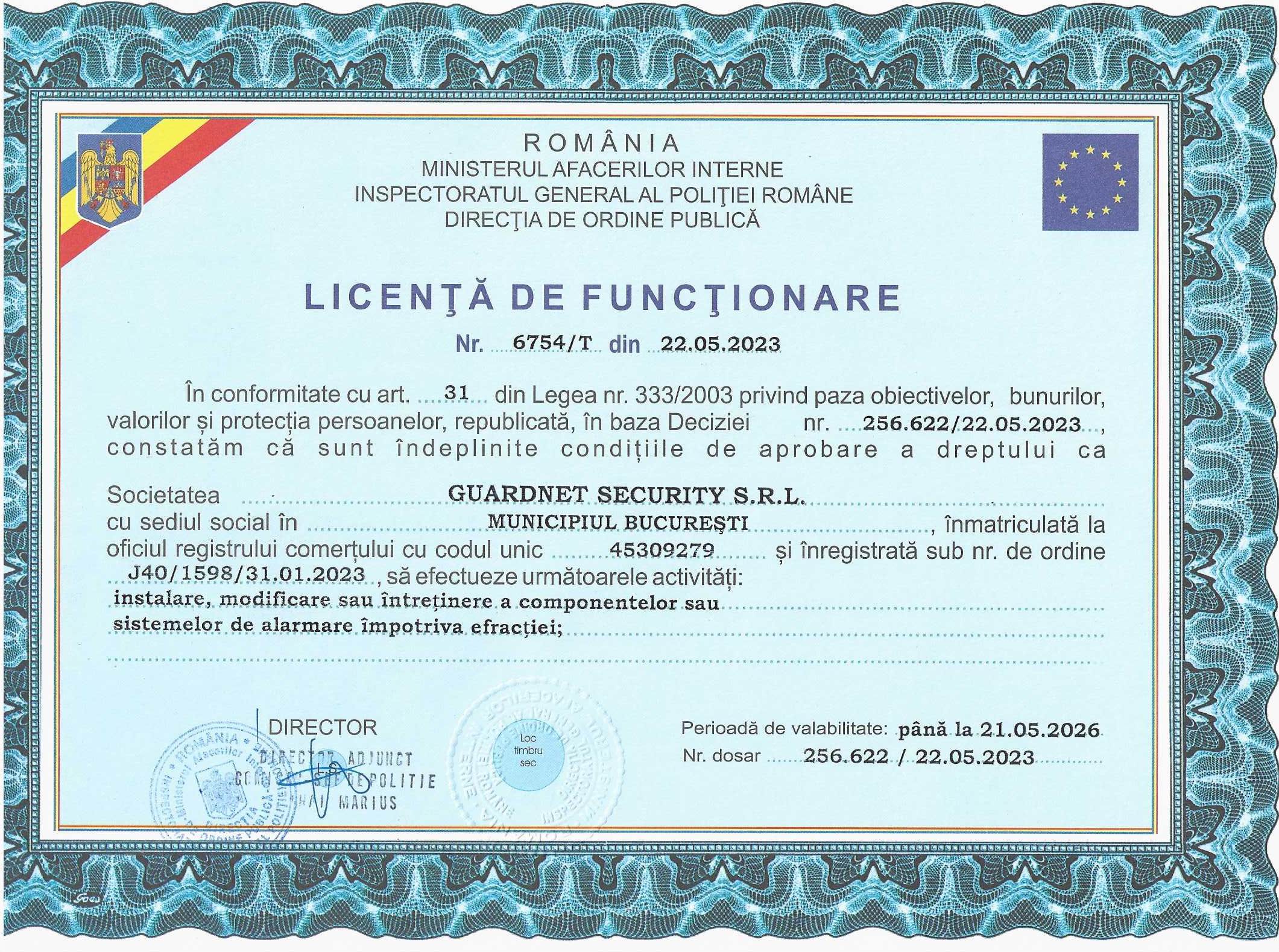 Pentru a-si desfasura activitatea in termeni legali si la un standard de calitate care sa satisfaca cerintele clientilor, societatea SC GuardNet Security SRL este inregistrata si licentiata pentru instalarea, mentenanta si service-ul sistemelor electronice de securitate